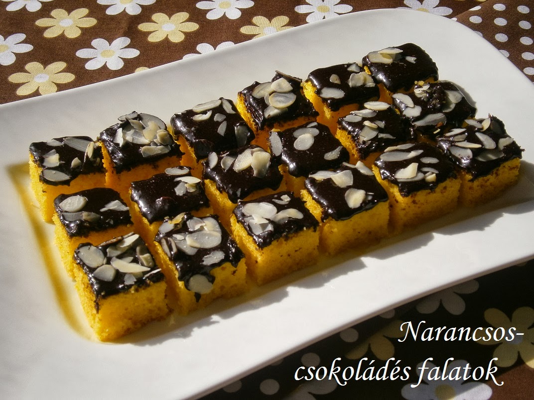 A tepsit alaposan kikenjük vallaj, és az aljára szórjuk a mandulát. A tésztához való vajat felolvasztjuk, hagyjuk lehűlni. A tojást habosra, krémesre keverjük a porcukorral és a vaníliás cukorral. Az alaposan megmosott narancs héját lereszeljük, a levét kifacsarjuk (nekem bő 1,5 dl lett), mindkettőt a tojásos keverékhez adjuk a kihűlt, olvasztott vajjal együtt. Végül a sütőporral elkevert rétesliszt kerül a tésztába, fakanállal eldolgozva. A tésztát a vajas-mandulalapos tepsibe öntjük, és előmelegített, 175 fokos sütőben 25 perc alatt megsütjük. A sütőből kivéve hűlni hagyjuk. A mázhoz lábasban felolvasztjuk a vajat a vízzel, hozzákeverjük a porcukrot és a kakaóport, és kis lángon szép, egynemű masszává főzzük. A tojásfehérjét kemény habbá verjük, és a forró csokoládémázba forgatjuk, elkeverjük. A forró mázat a már csak langyos sütemény tetejére öntjük, finoman elegyengetjük, majd megszórjuk a mandulalapokkal és hagyjuk kihűlni. Apró kockákra szeletelve kínáljuk.