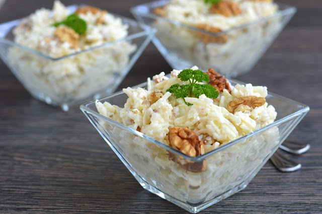 A majonézt elkeverjük a joghurttal, ízesítjük sóval, borssal és nyírfacukorral. Beleforgatjuk a zellert, az almát és a diót. Tálkákba szedjük, dióval díszítve kínáljuk.