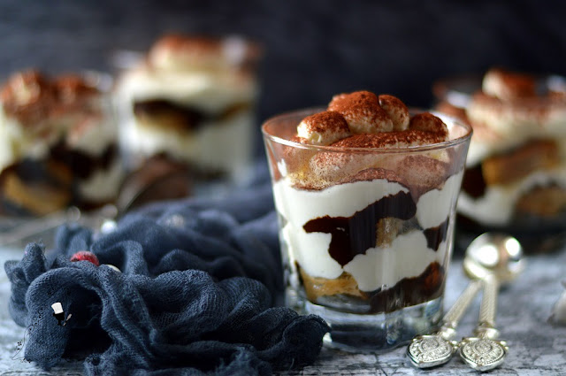 A falatnyi darabokra tördelt, kávéba mártott babapiskótát, a csokoládéöntetet és a krémet a poharakba réte- gezzük – a tetejére krém kerüljön, amit a legegyszerűbben sima végű habzsákból adagolhatjuk. A tiramisut néhány órára behűtjük, majd a tetejét kakaóval meghintve tálaljuk.